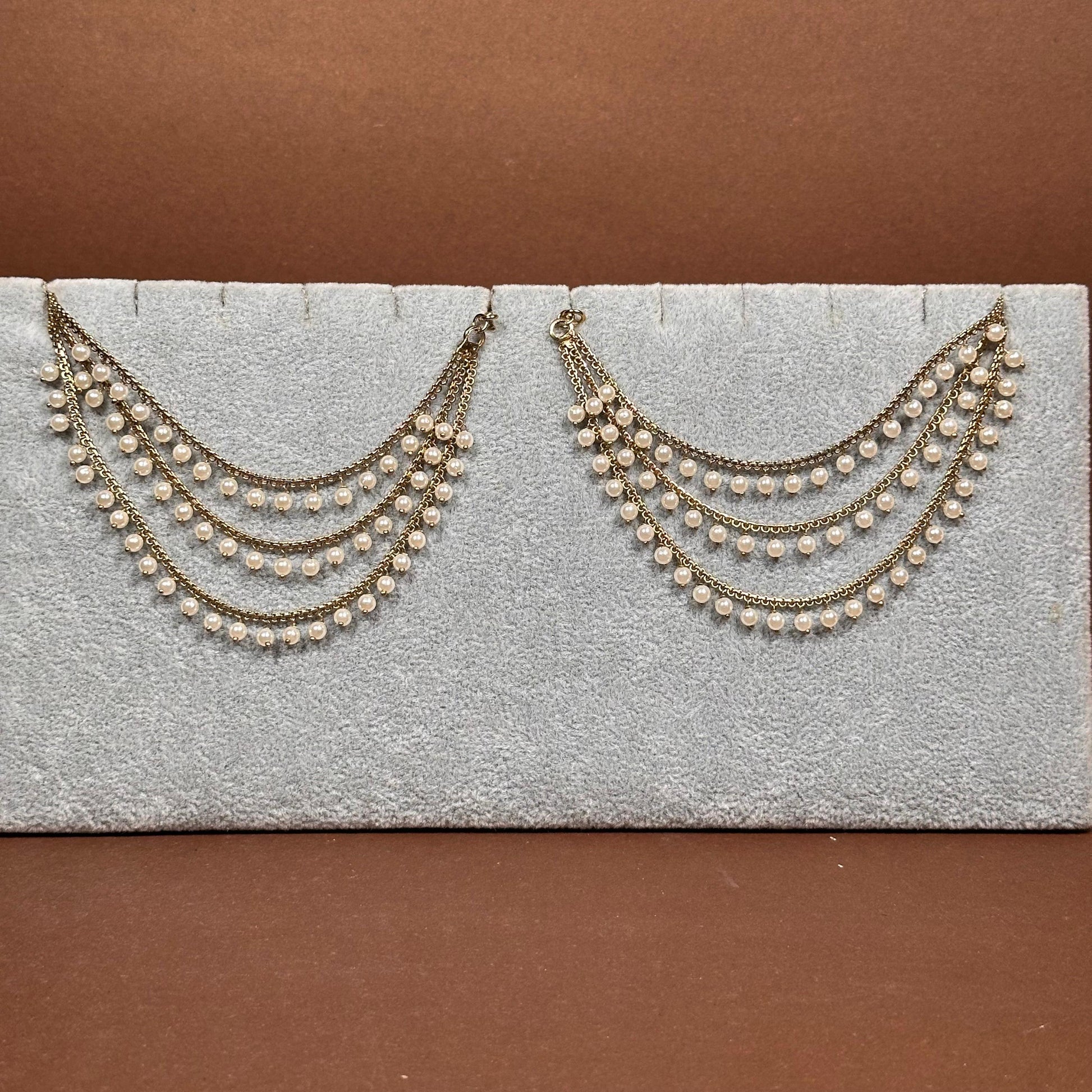 Elevate your traditional ensemble with our 3 Layers White Pearl Saharay , an exquisite expression of heritage and elegance. Adorned with lustrous pearls and intricate gold-toned detailing, this saharay drapes beautifully beside your earrings, adding a royal charm to your bridal or festive look.