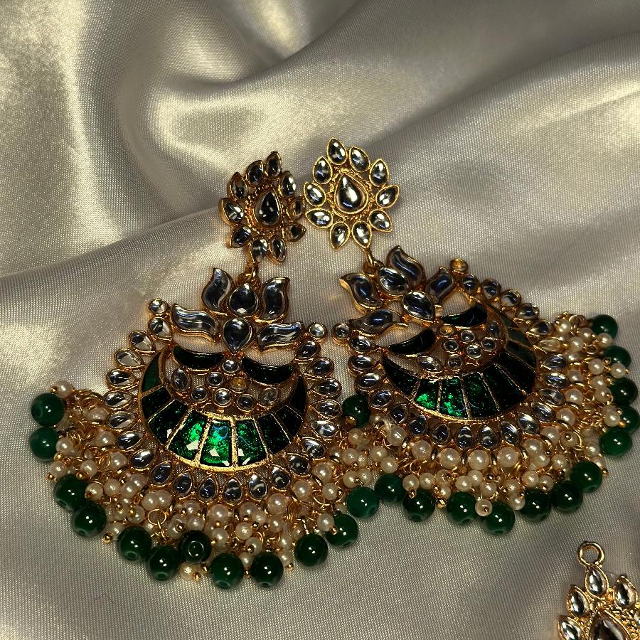 Introducing our Kundan Earrings With Ethnic Faux Beaded Enamel in a delightful hue – a captivating ensemble designed for the discerning individual. Embellished with pearls and beads, these Earrings exude timeless charm and cultural allure. Additionally, they can be customized in any color, providing a personalized touch to suit your preferences.