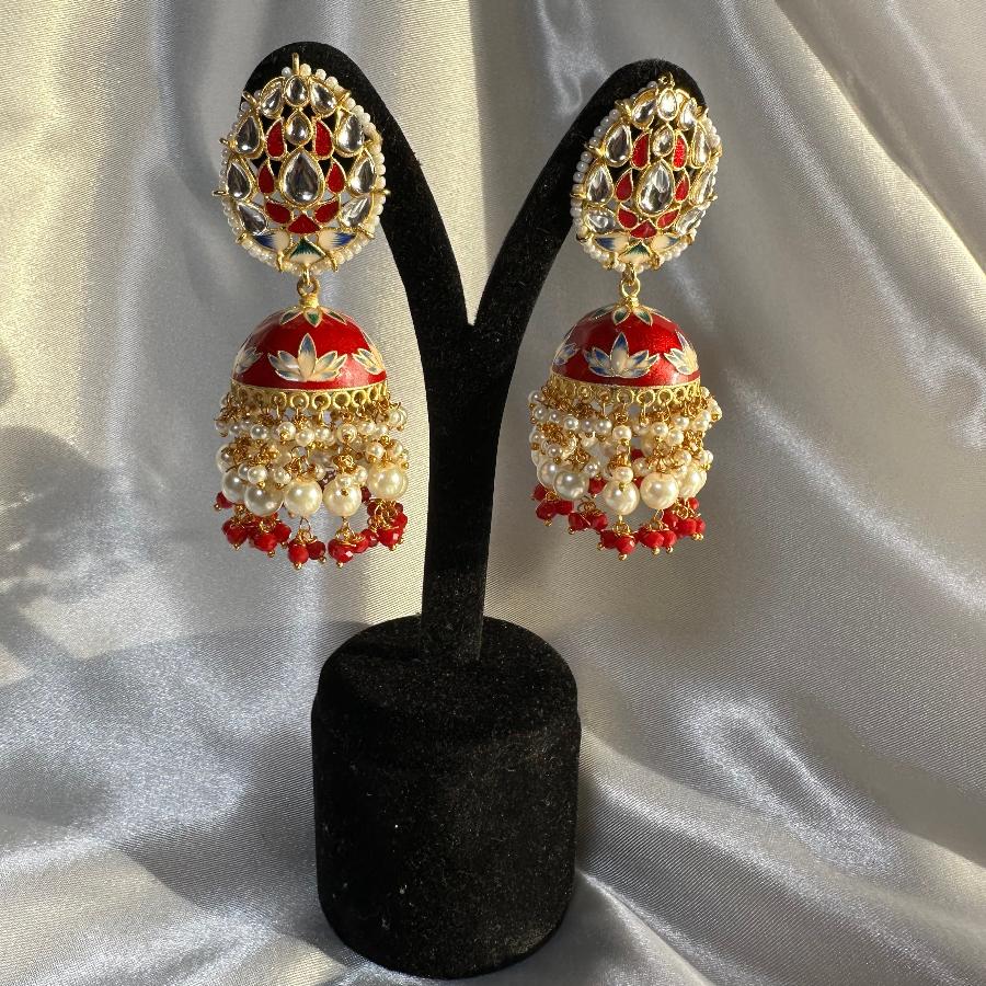 Kundan Floral Enamel Jhumka Earrings with Beaded Tassels Red